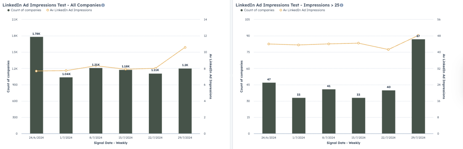 The first report shows the total number of companies with LinkedIn impressions each week and the average number of impressions per company.