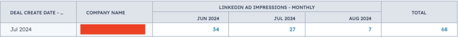 For a simpler approach, use the report below to track LinkedIn impressions at a high level on a monthly basis. This report shows companies with a threshold of LinkedIn impressions and any associated deals. Again, an average of impressions can be applied here to smooth out any anomalies.