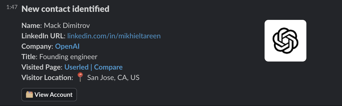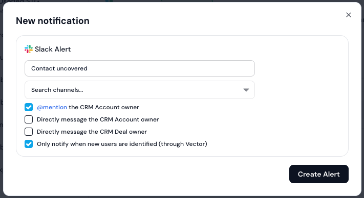 As part of Vector's integration, we provide an out-of-the-box Slack notification which alert you every time we uncover a visitor through Vector.