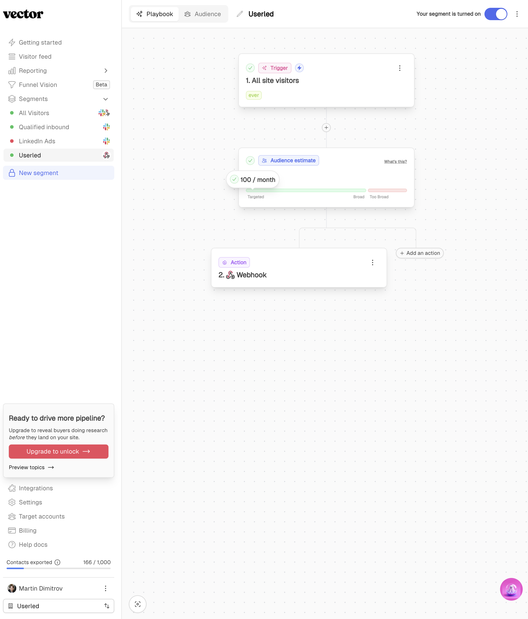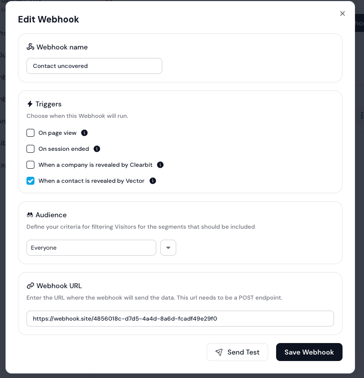 As part of Vector's integration, we provide an out-of-the-box Webhook setup which emits an event every time we uncover a visitor through Vector.