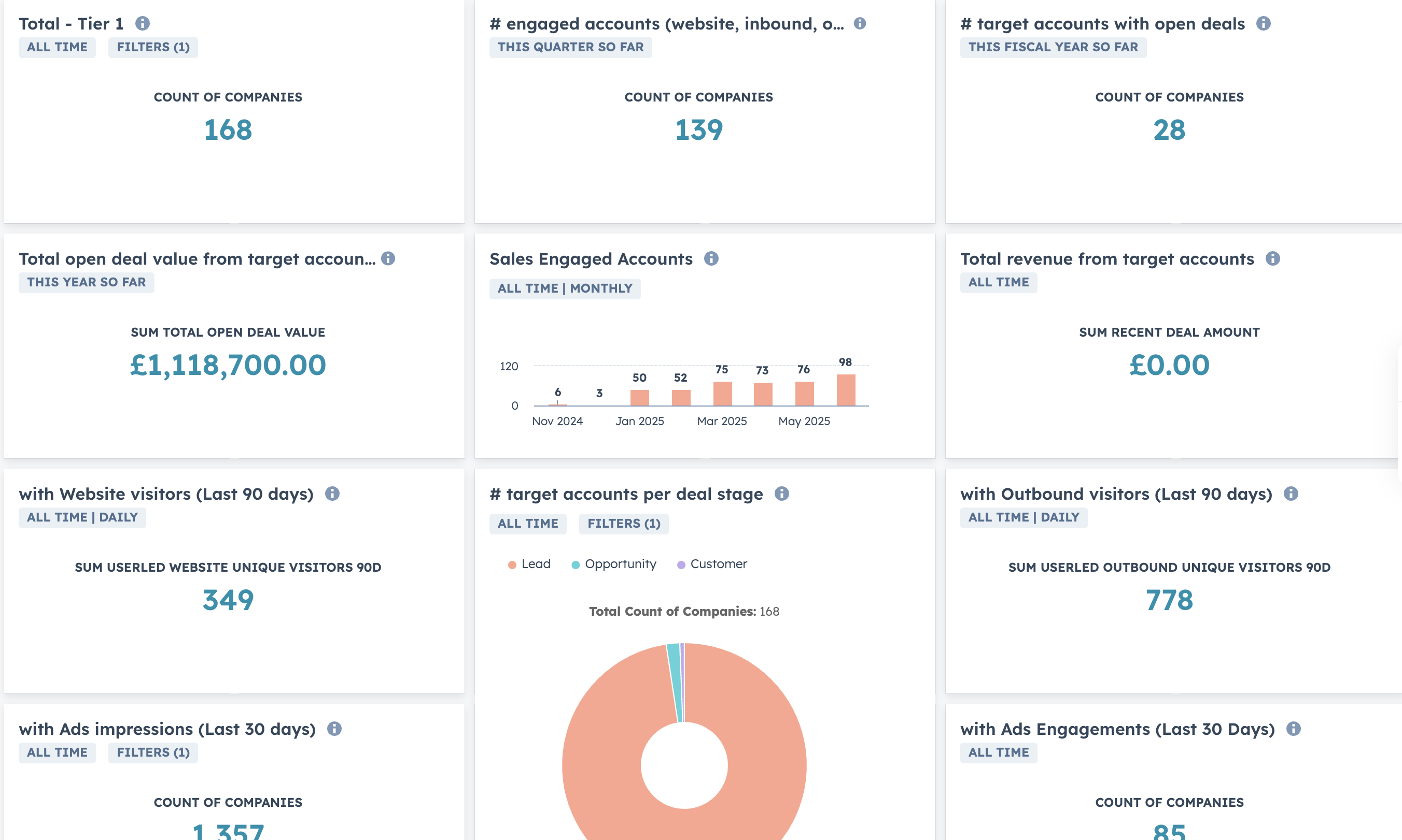 An ABM Overview Dashboard centralises all your account engagement data in one view. It shows which target accounts are engaging, their activity levels, and pipeline influence - giving sales and marketing teams a unified view of account health and priority.
