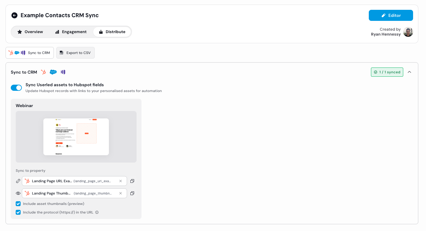 In Userled campaign, under Distribute, you can sync to your above created or existing Userled Properties in Hubspot. Sync the Landing Page URL as well as the Thumbnail URL.