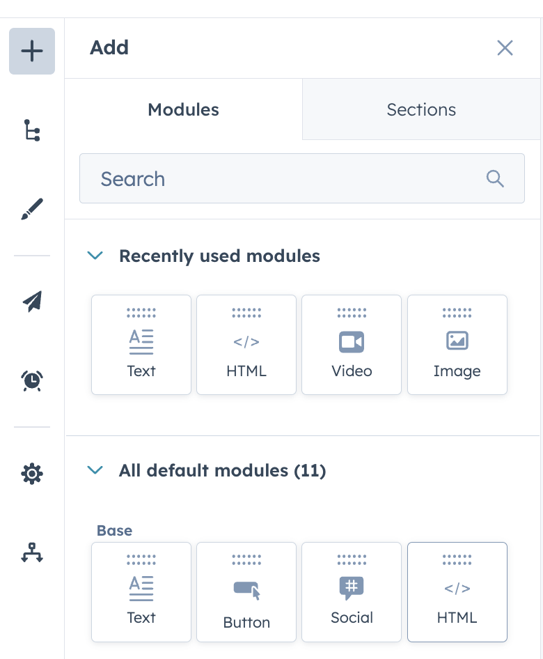 - In the email editor, add a Custom HTML module (drag-and-drop: sidebar > Custom HTML)
