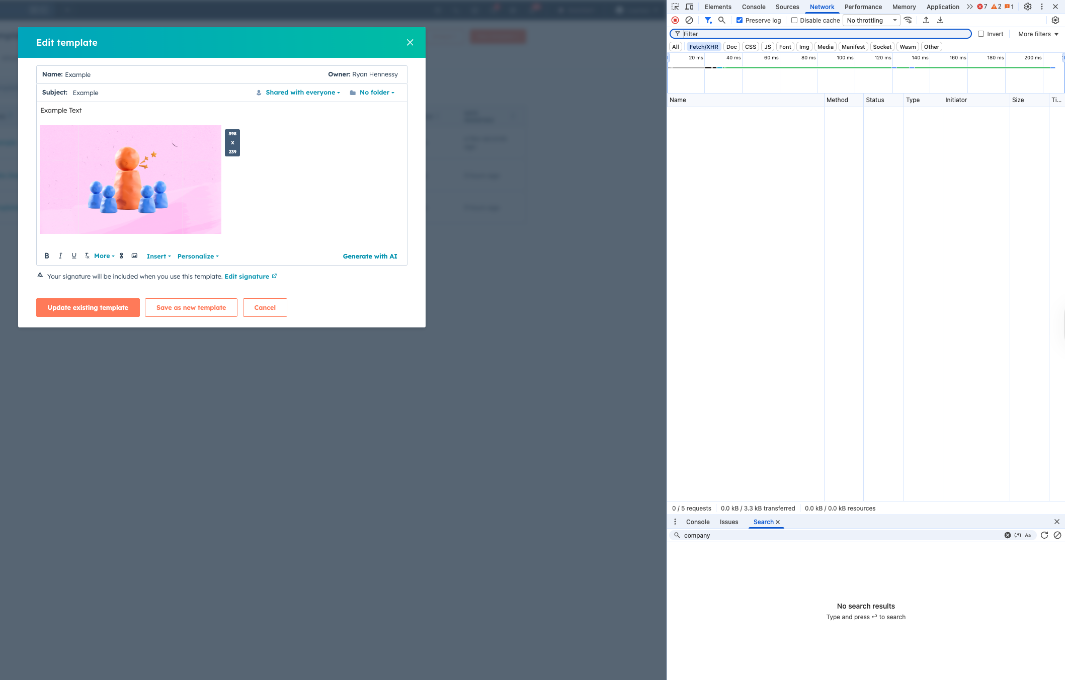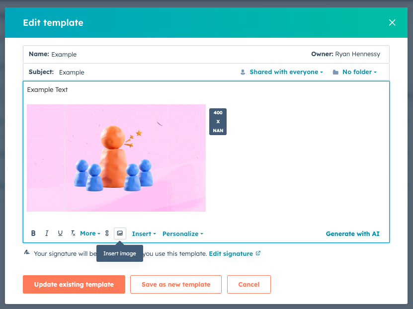 First, go to the email template editor in the sequence. Add one image to it along with some text, as HubSpot won’t let you save without text. This can be a random placeholder image for now, as in a later step, we will update the image to be dynamic based on a property in your CRM.