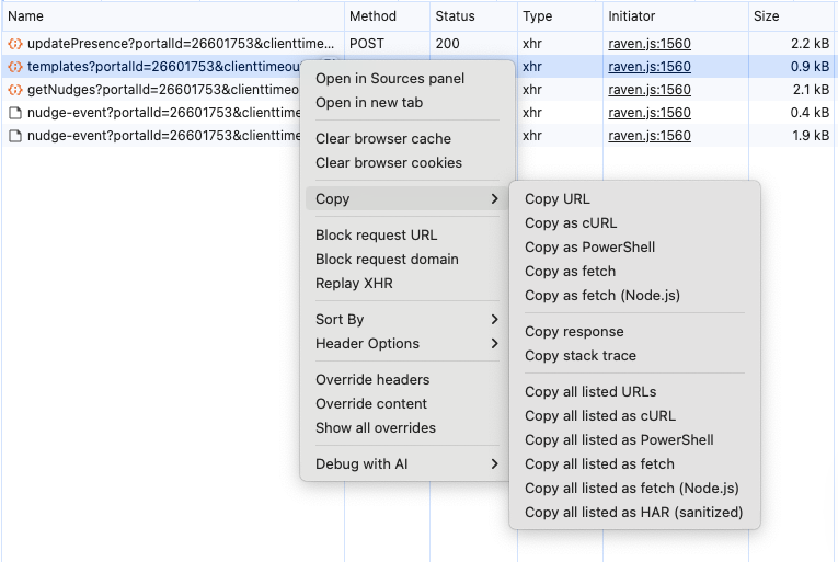 Right click the row that starts with templates?portalId=... and Copy as fetch (4th option shown)