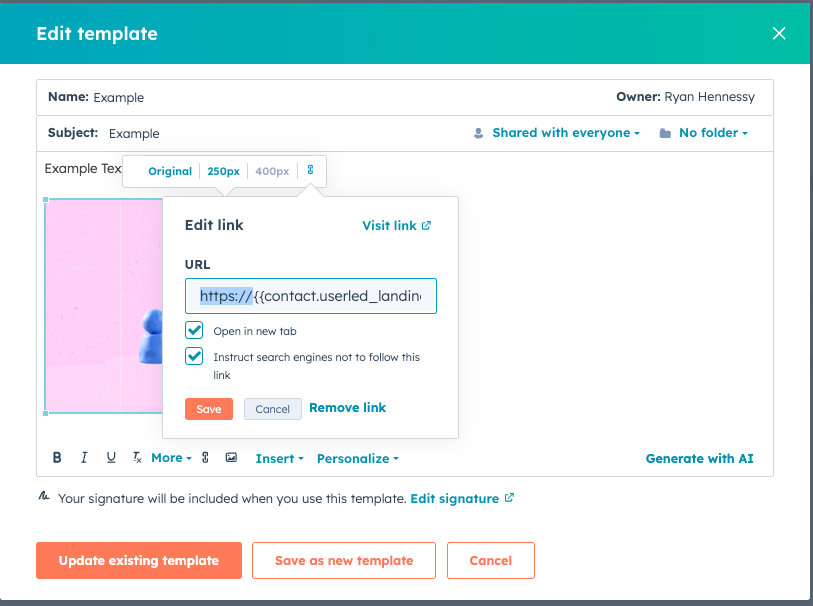 If you open the template, the image should have changed to look like this. If you click on the image and the link icon, the link’s value should hold the variable you inserted earlier https://{{contact.userled_landing_page_url}}. The width and height should also match the one you specified.