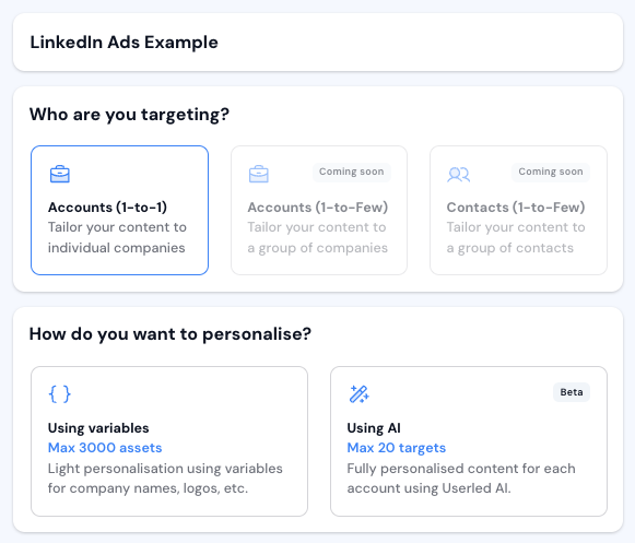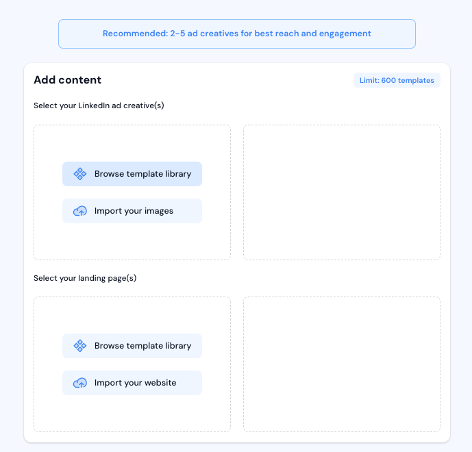 Either import your LinkedIn Ad creative from the Userled template library (recommended). Use at least 1 LinkedIn Ad creative, although we recommend to use 2-5 for best reach and engagement.