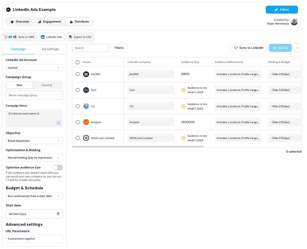 This guide will walk through creating a campaign and syncing to LinkedIn Ads Campaign Manager