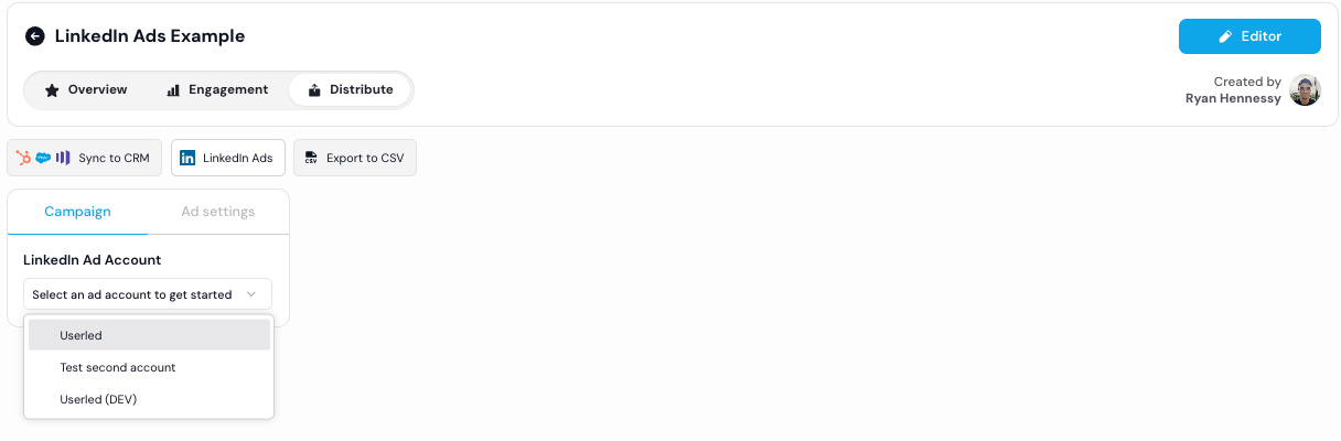 Select the ‘Distribute’ tab and select ‘Linkedin Ads’. Under the ‘campaign’ you should first select the Ad account you wish to use.
