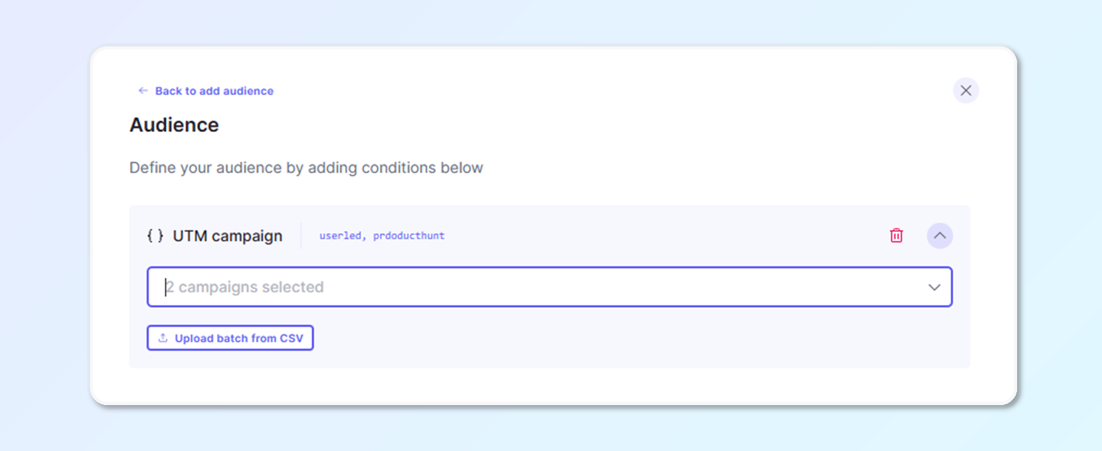 This condition allows for several UTM campaigns to be evaluated at the same time. You can add them one-by-one using the text-box or upload them in batch from a CSV. When doing so, make sure to label the first column header as CAMPAIGNS, as shown in the CSV Template provided here