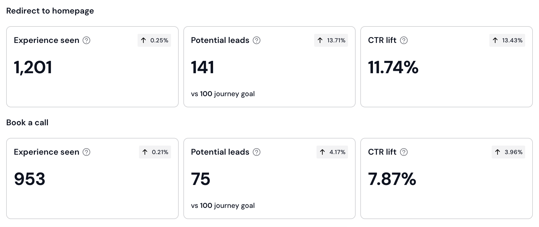 For instance, you can observe that the 'Redirect to homepage' experience has a higher success rate, enabling you to refine your journeys by closely monitoring traffic engagement. This detailed information allows you to evaluate the contribution of each experience to the total leads generated.
