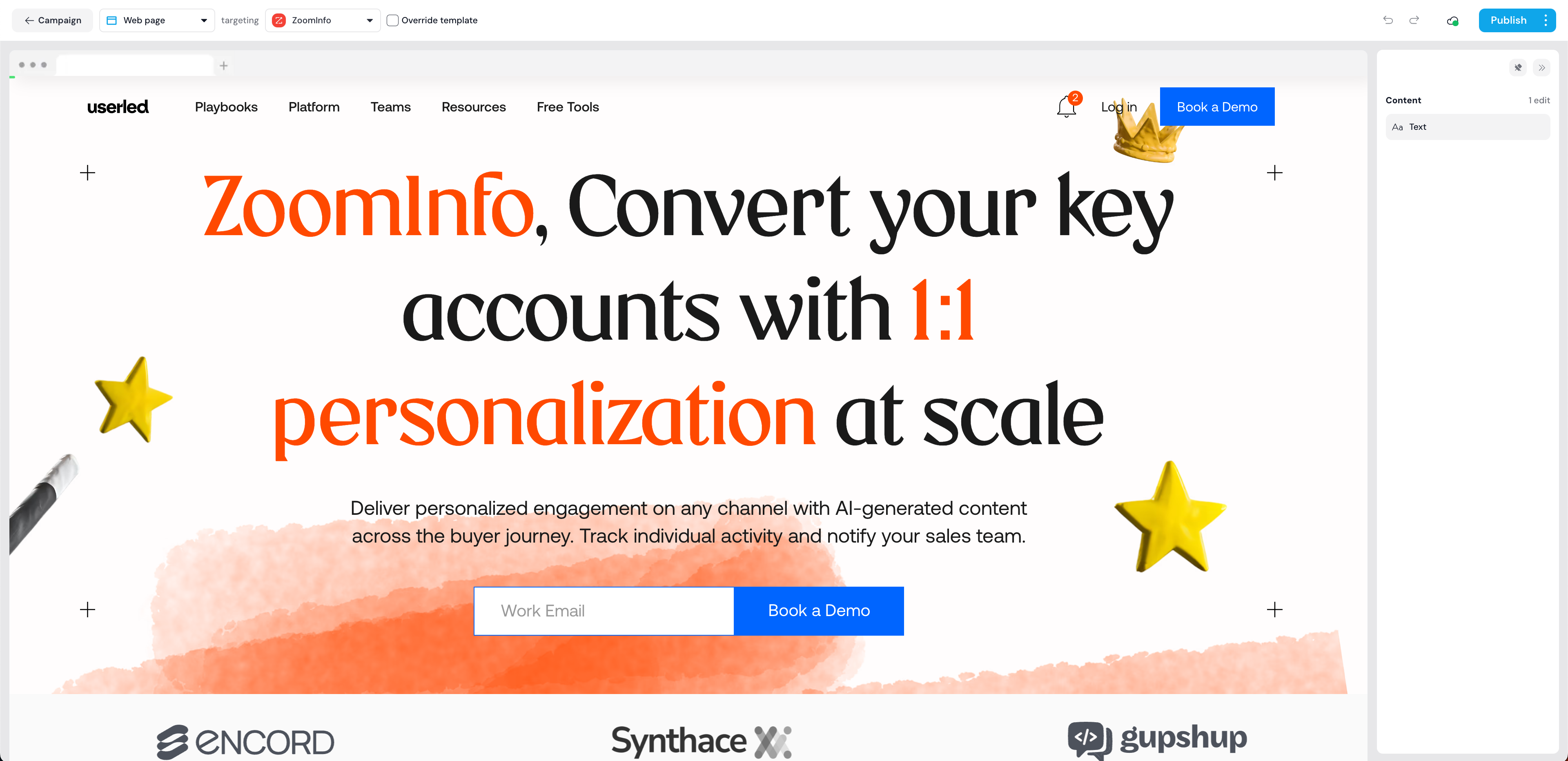 You can import any webpage from a domain you own into our editor and personalise it to your liking. Our powerful website editor provides you with content variables to personalise your website at scale for different target accounts and contacts.