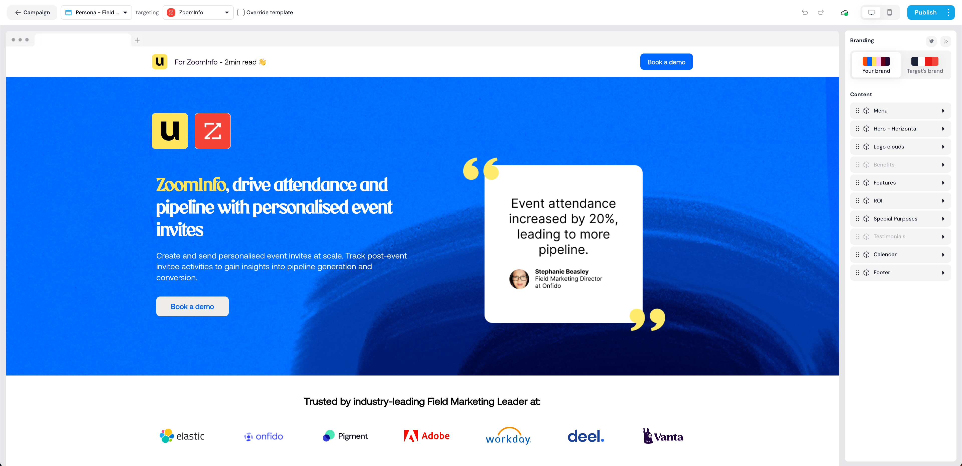 The web experiences are fully customisable: you can replace and hide elements, and use variables to personalise your content further: company name, industry, job position… all of this enables you to specifically target your chosen audience with what matters to them, and push your solution forward in a way consistent with your branding and messaging.