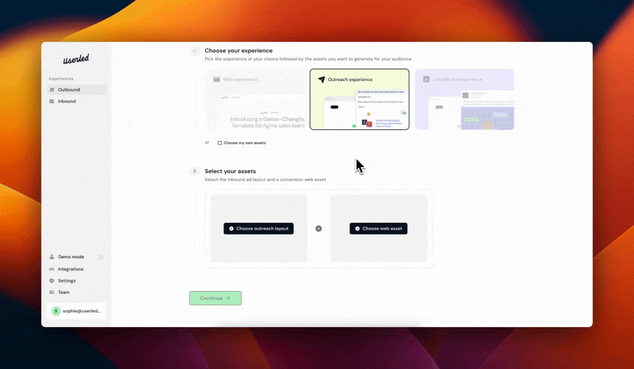 Step 3 - Select Outreach experience in the asset selection page and choose the format of your image asset: email banner or landscape image