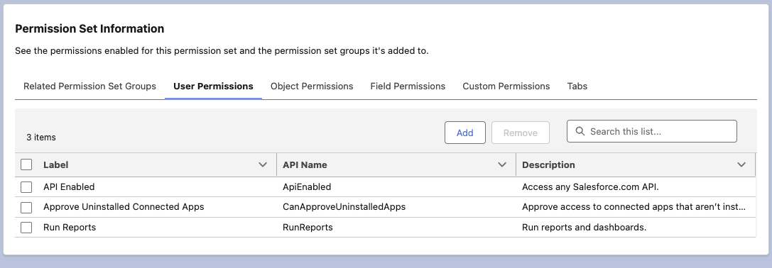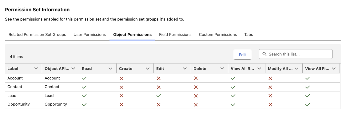 For details of field access via permission sets (Permission Set Information) please refer to the breakdown below.