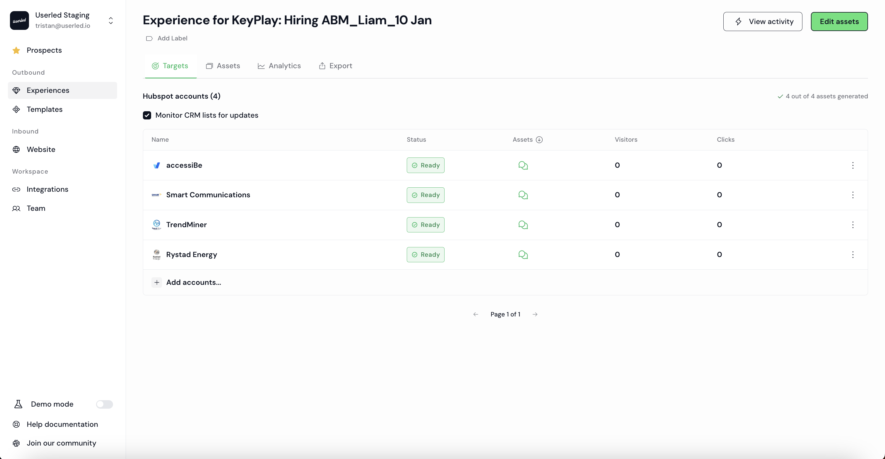 When new accounts are detected and added in Userled, we will generate the experience for that account automatically. This allows you to start with smaller target lists and scale them indefinitely!