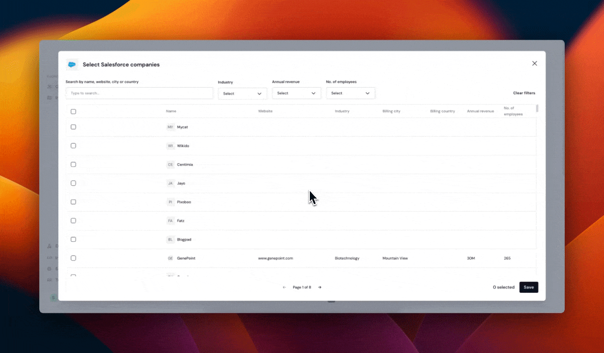 When creating a new experience, you can select accounts from Salesforce. Use the search bar to find specific accounts or apply filters to find accounts matching your criteria.