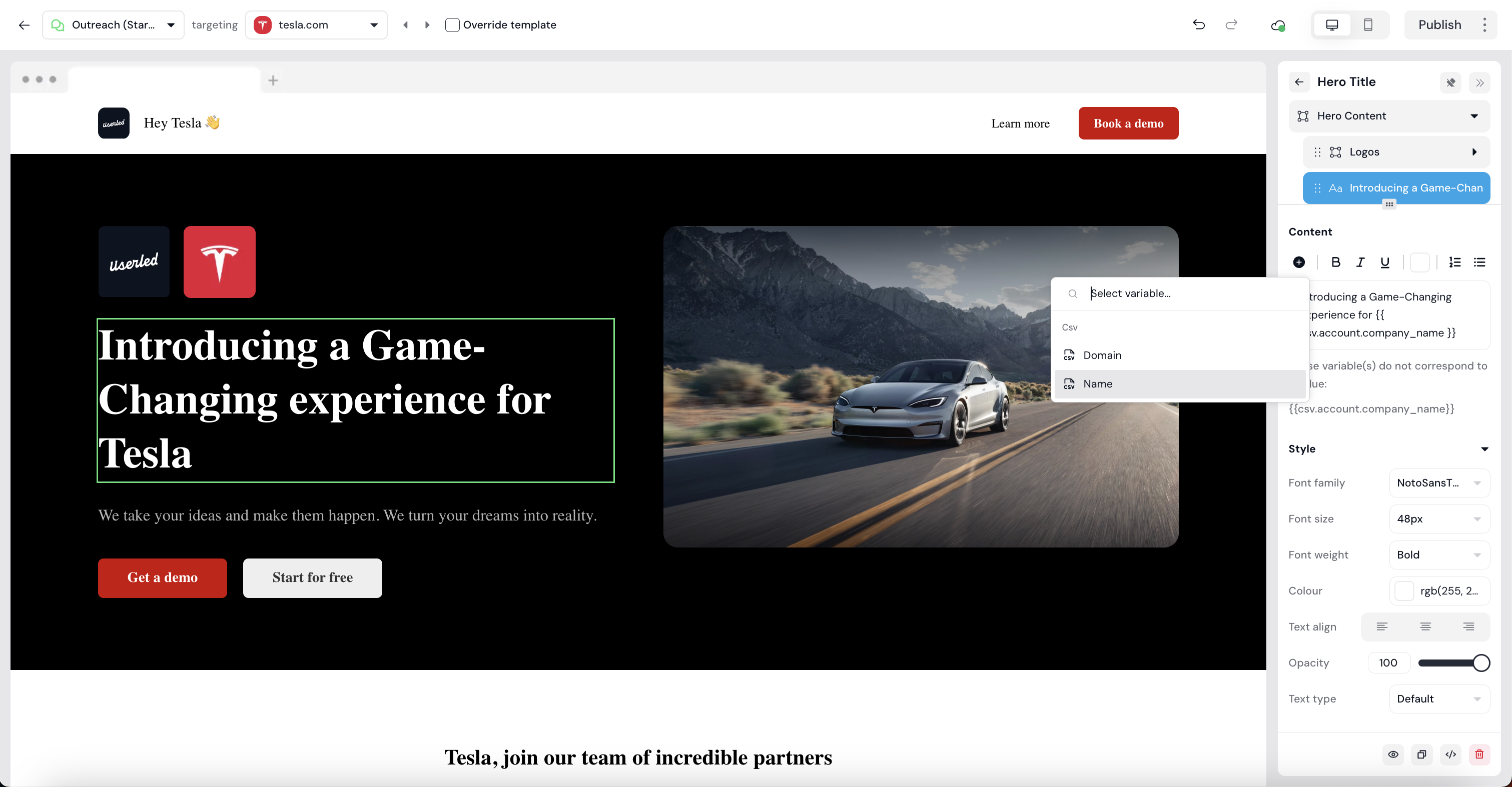 The column headers you add to your CSV are available to you as variables in the editor to personalise your experience for your target contacts.