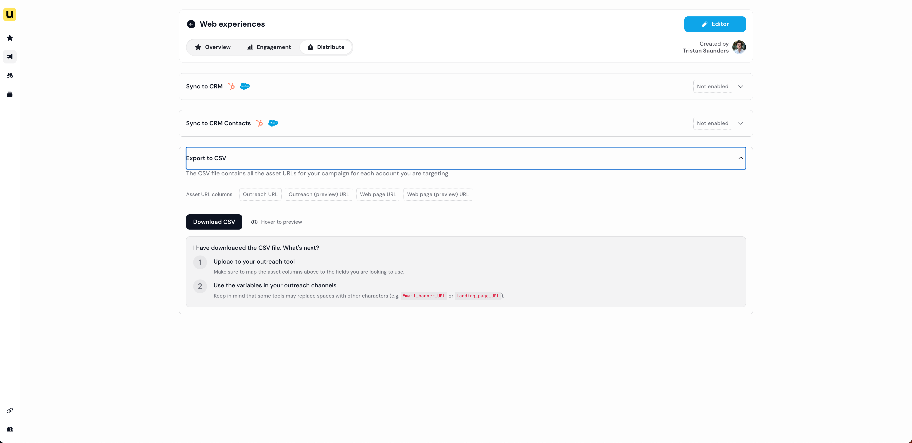 The exported CSV will be mapped according to the assets created: Landing Page URL, Email Banner URL etc so you can easily recognise which assets to use during your outreach.