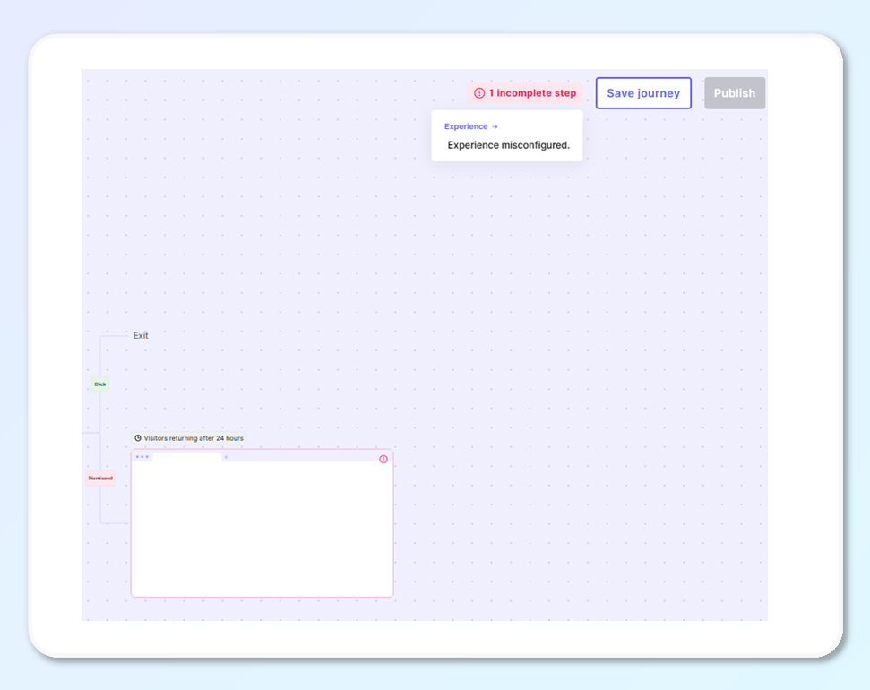 You can easily find which steps are incomplete: the incomplete experience will have a red border and the❗mark, while nav bar will have a label that indicates the # of incomplete steps and a list explaining what step needs to be completed. Simply click on the relevant list item and you’ll be redirected to the journey step to complete
