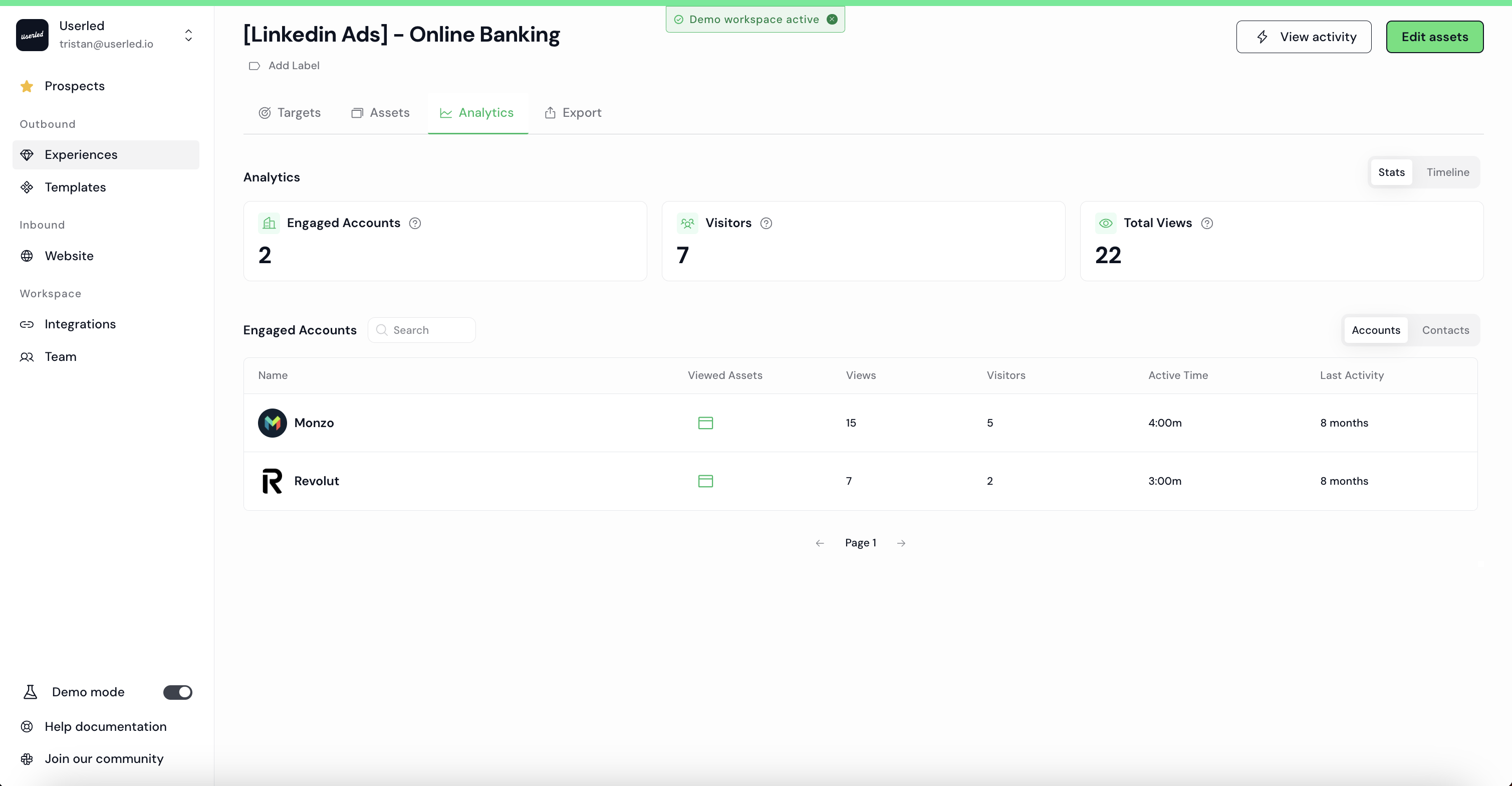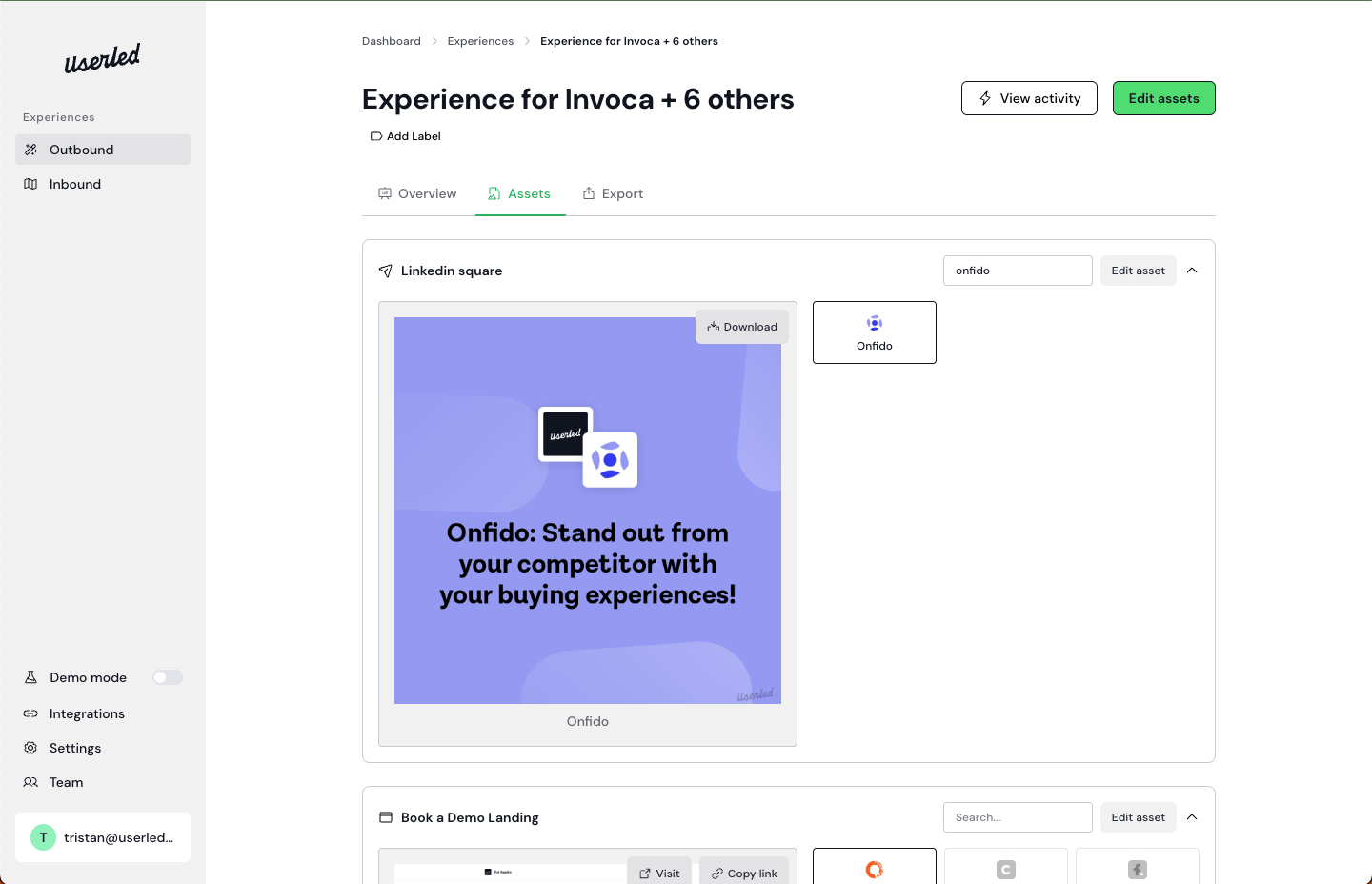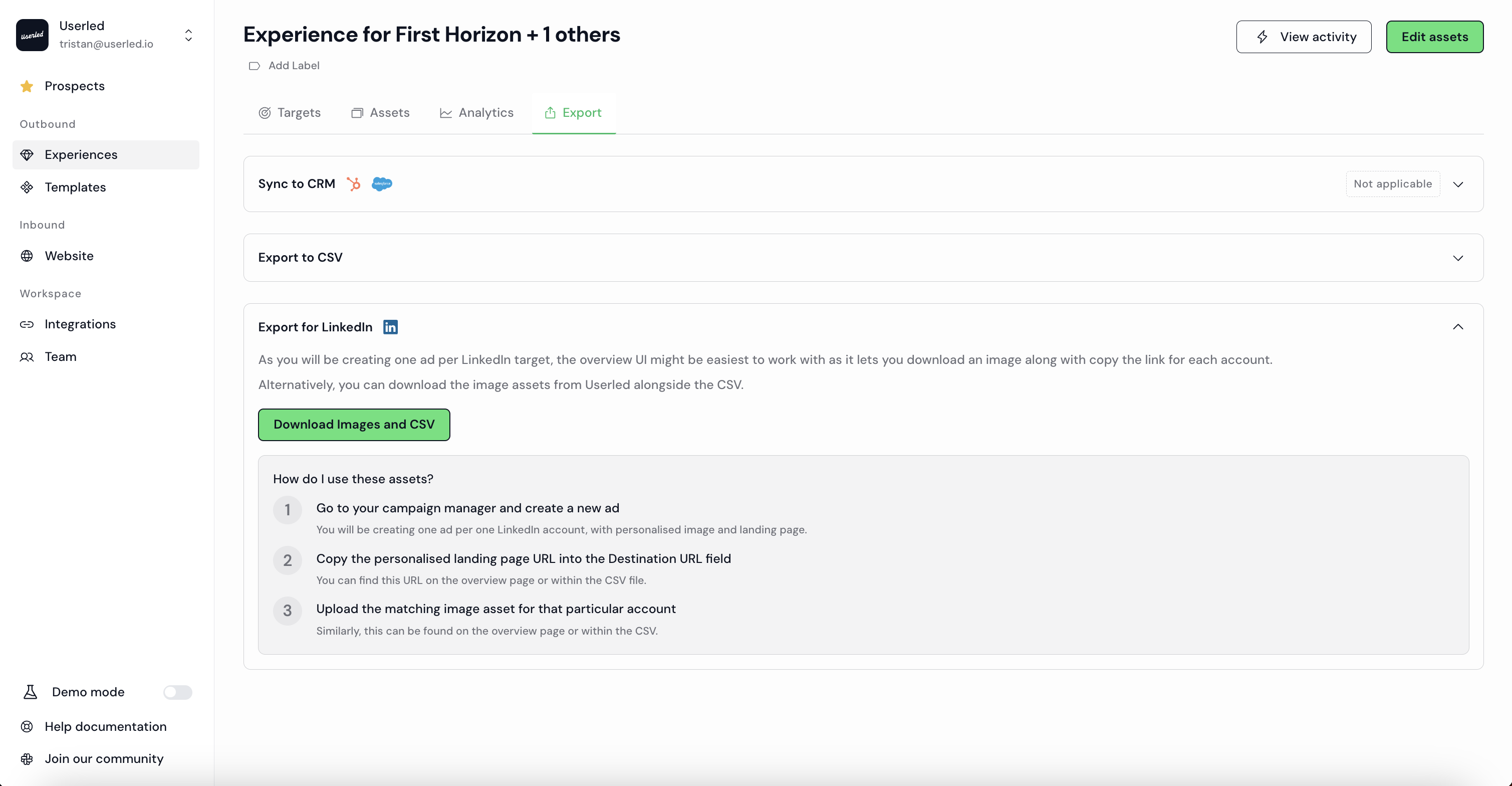 For LinkedIn Ads you will need the landing page URL(s) and the image(s) you generated. For a quick export, you can get these from the Assets tab in your campaign overview.
