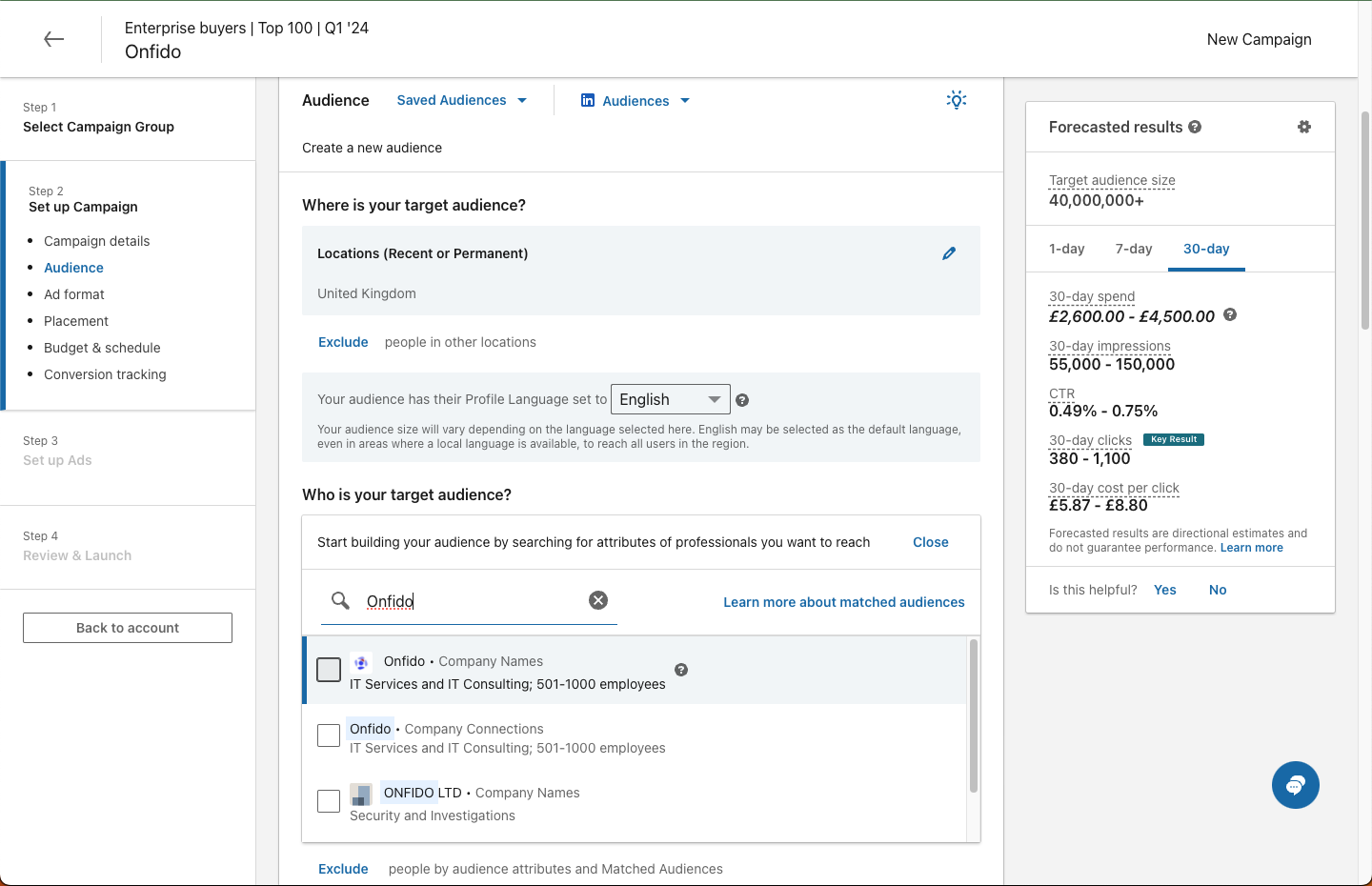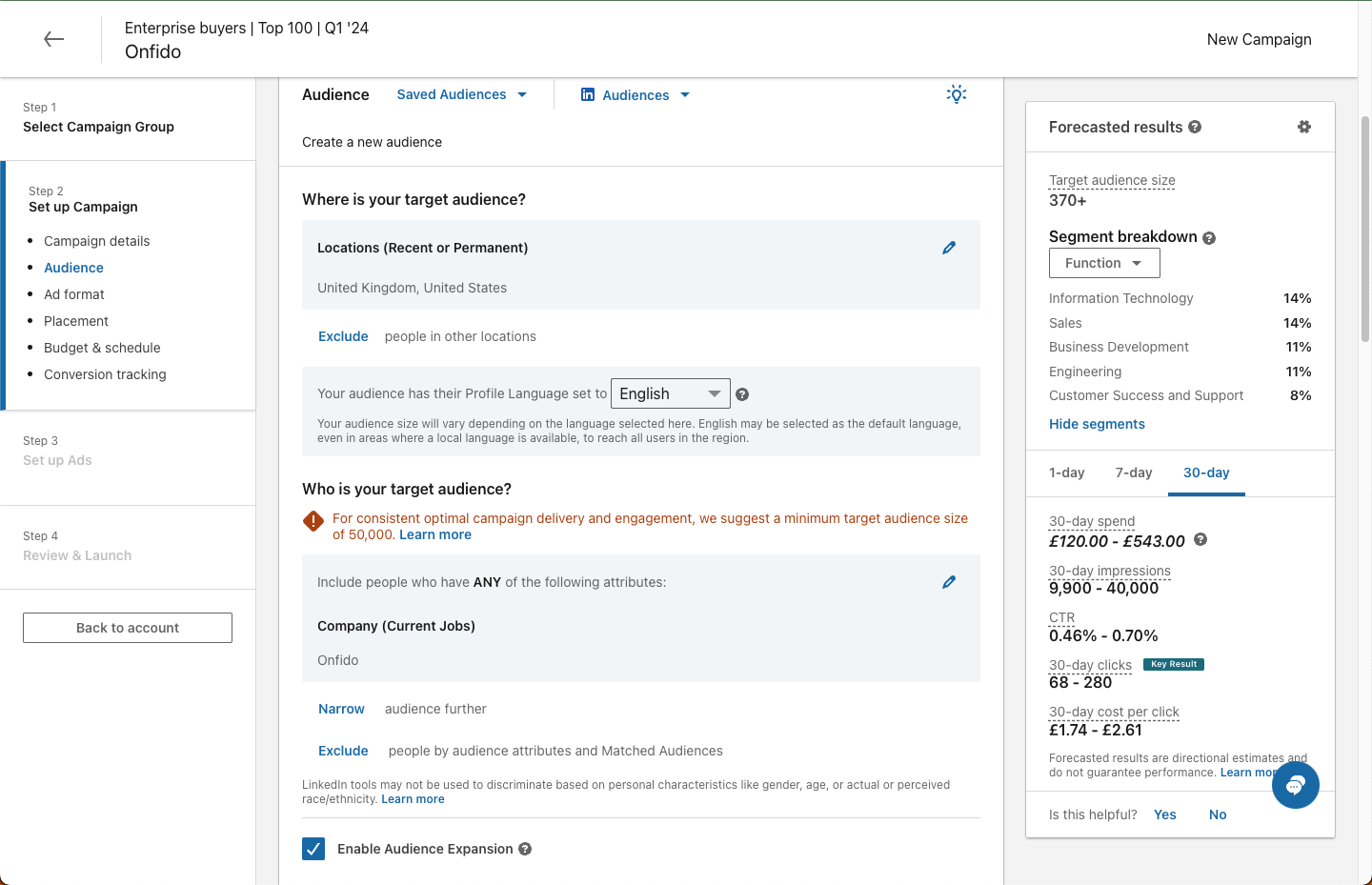 If you are new to LinkedIn ABM ads we recommend experimenting with a budget of around $15 per day or the equivalent in your local currency.