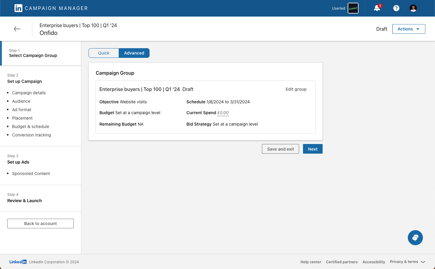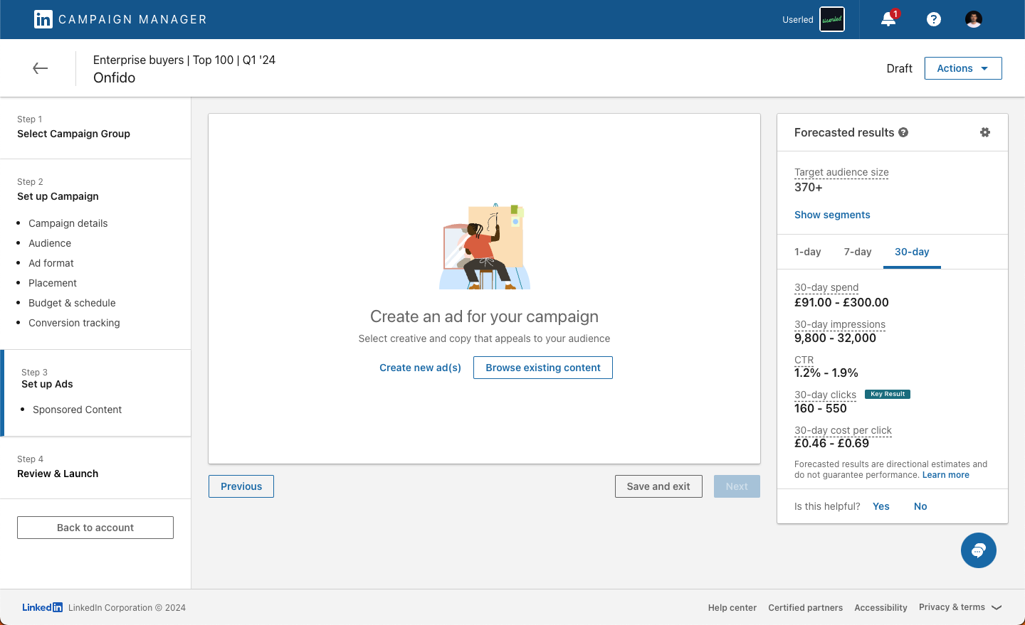 If you have already created a campaign and wish to add your assets you can skip forward to “Setup your LinkedIn ads with Userled assets”