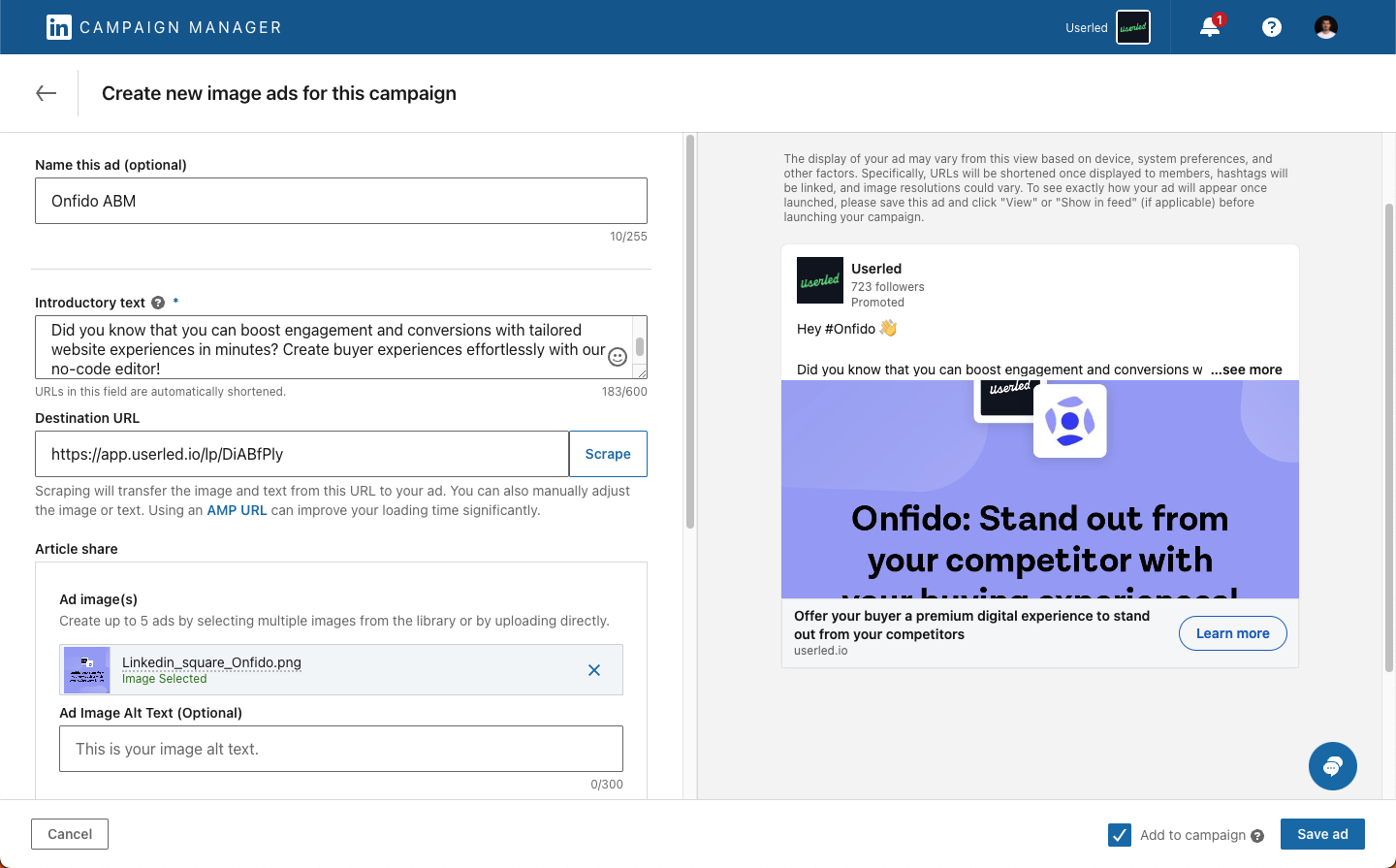 Download the image from the Userled app and upload it to “Ad image(s)”