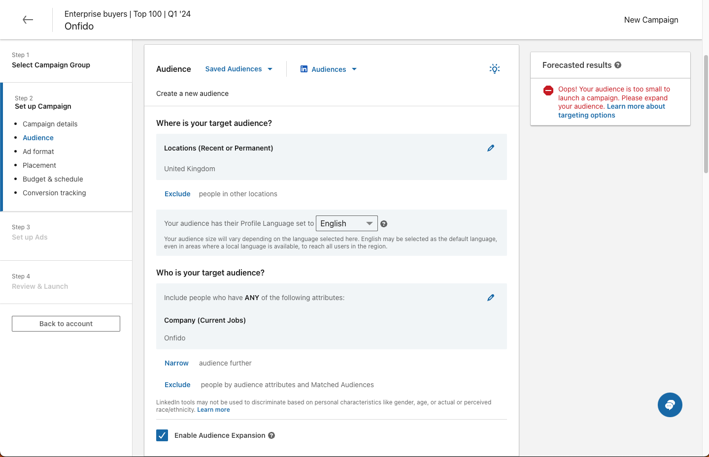 Make sure you target the appropriate location(s). Adding more locations may widen your audience size. In this example, targeting the United States results in a valid audience size as most of Onfido’s workforce is located in the US.
