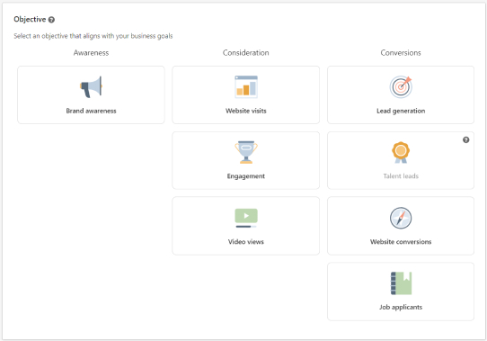 Choose an objective that aligns with your business goals. We recommend “Brand awareness” or “Website visits” with the goal of capturing your buyer’s attention and driving them to personalised marketing landing pages.