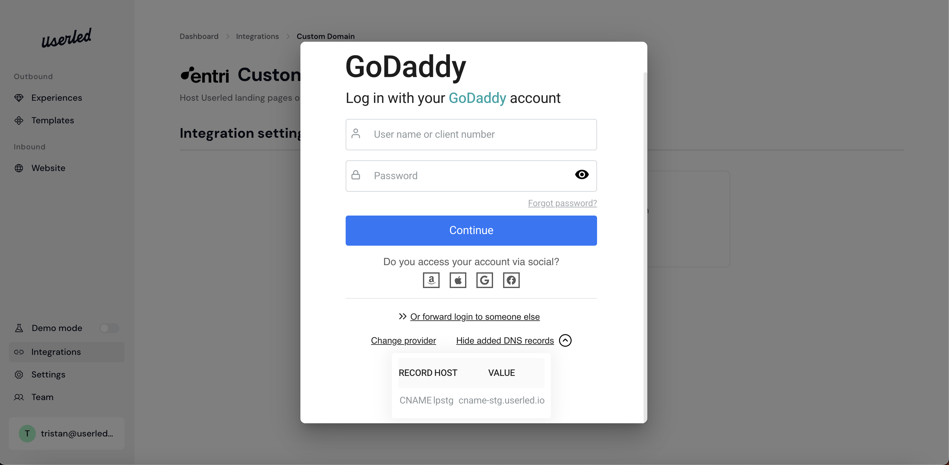 Userled will detect your DNS provider and prompt you to login to authorize and connect your new subdomain on your behalf. If you don't have admin access to your DNS provider, you can invite an admin to do so on your behalf (see section below).