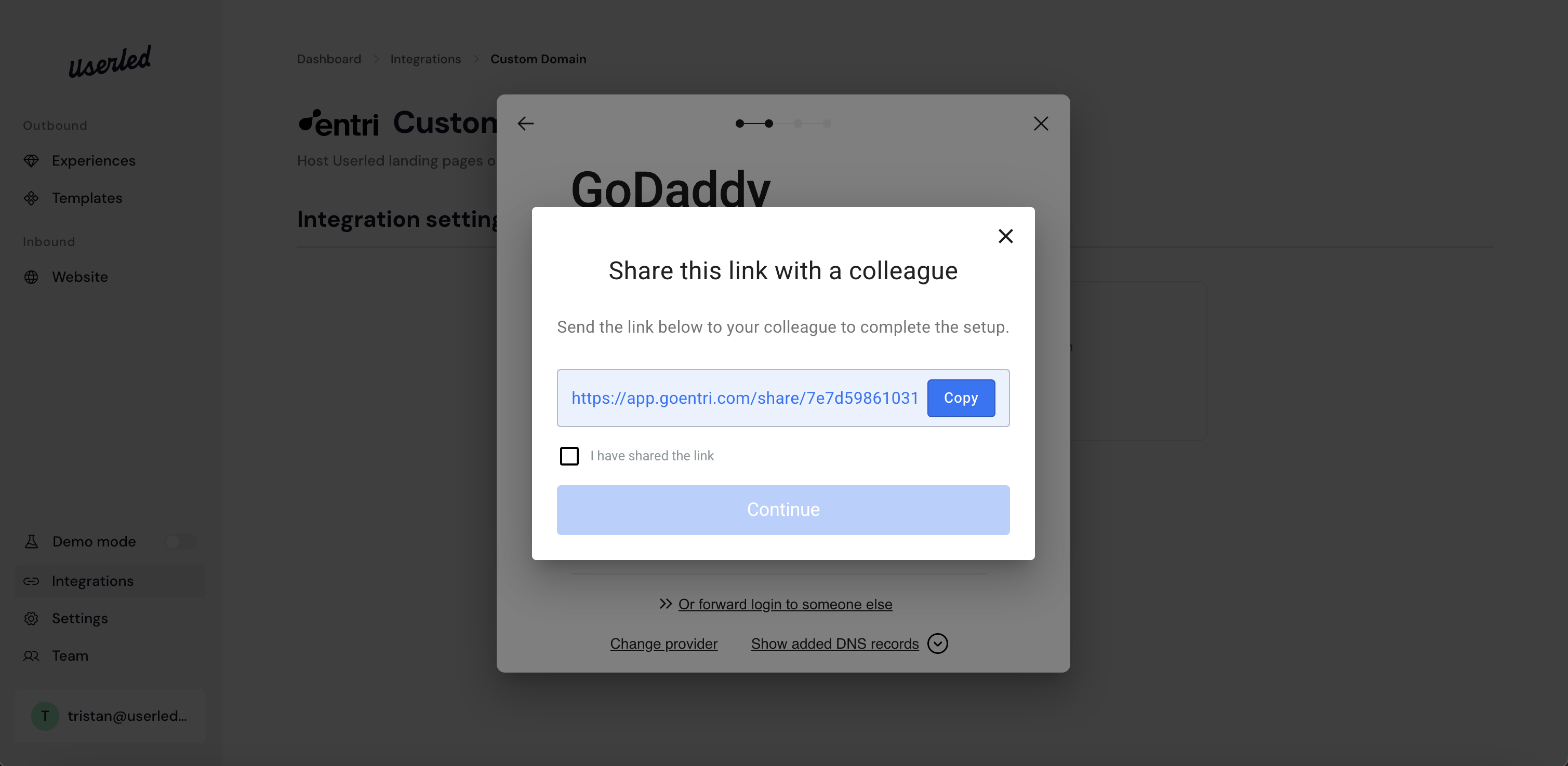 Once shared, toggle "I have shared the link" so Userled can start verifying the connection".
