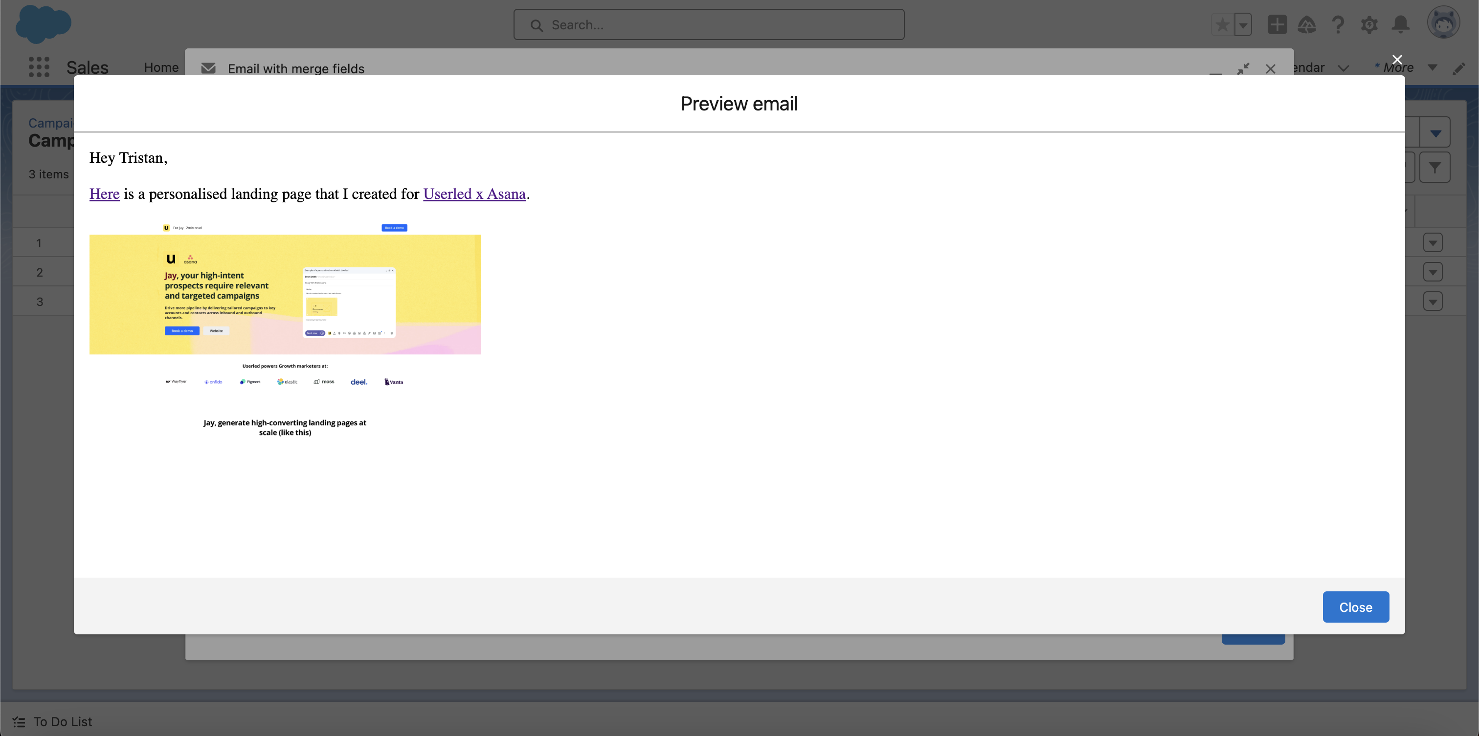 Running sequences from Salesforce is a very common use case and Userled makes it easy to include personalised content experiences in your outreach campaigns.