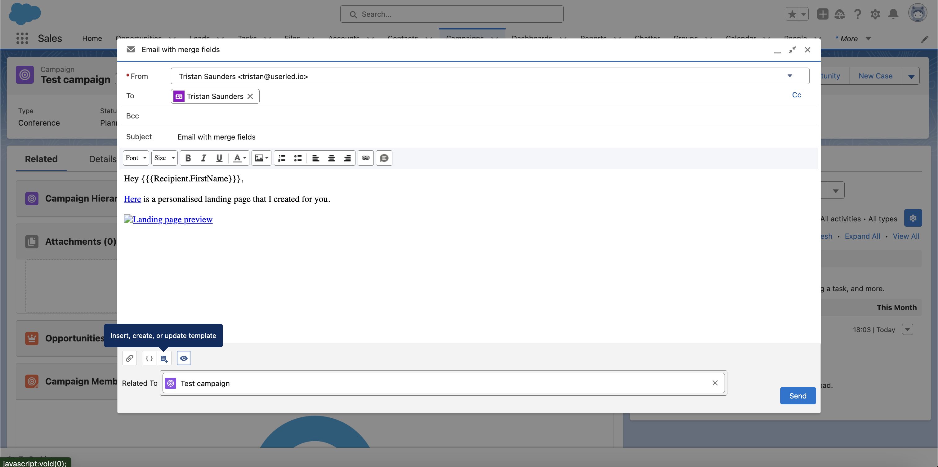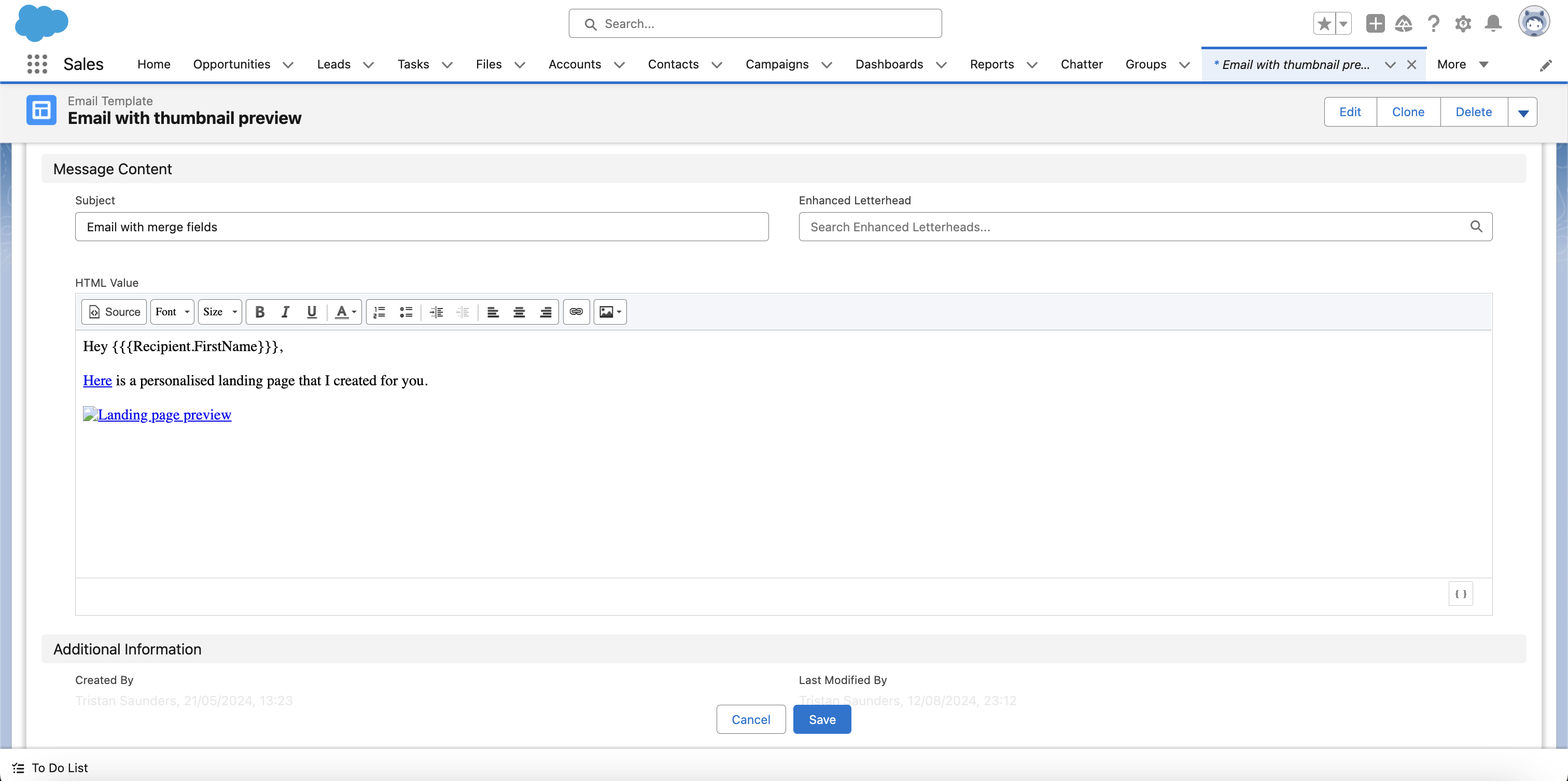 Note: in this example, we also include a personalised hyperlink that mentions the organisation (Userled) and the contact's account name (Asana). This requires additional setup to associate Account level fields to Contact level fields in order to be able to add Account object merge fields in lightning email templates. You can follow guidelines in this community post for achieving this or we recommend speaking to your Salesforce admin to help you set this up.